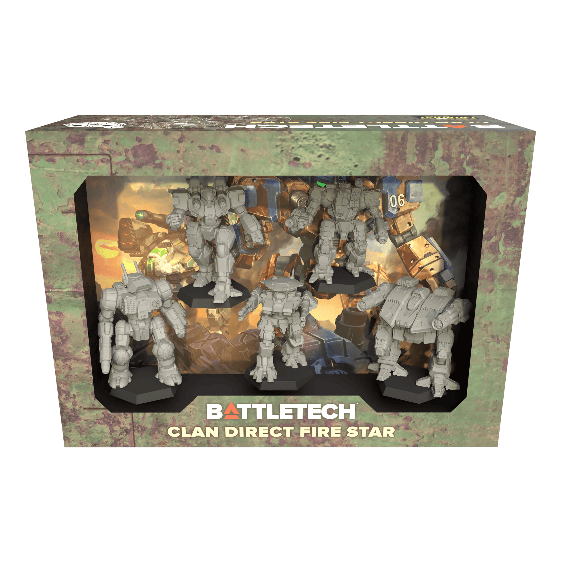 The BattleTech: Clan Direct Fire Star is a collection of five plastic miniatures for use in the classic BattleTech tabletop and Alpha Strike games. The box also provides five dry-erase cards, which are intended to directly support Alpha Strike gameplay, and five new Pilot Cards.