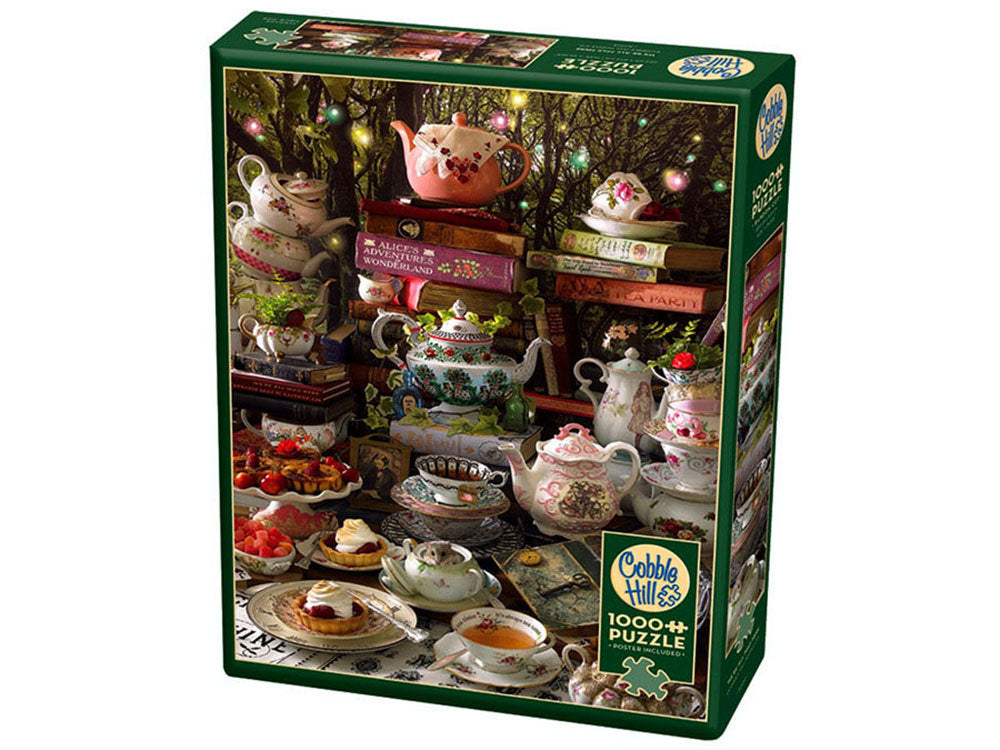 A Truly Original Photo (T.O.P.) puzzle created in-house by the Cobble Hill Creations design team starring the Dormouse in his sugar bowl. We're All Mad Here is a tribute to the classic Alice in Wonderland story with so much to discover well after its assembled. Take an adventure with Cobble Hill's 1000 piece random cut puzzle that includes a reference poster. Cobble Hill was founded in 2005 with a desire to bring loving, whimsical, high-quality images to puzzle enthusiasts around the world! Our puzzles have been described as nostalgic, lively, endearing, sweet, durable, and fine quality.
