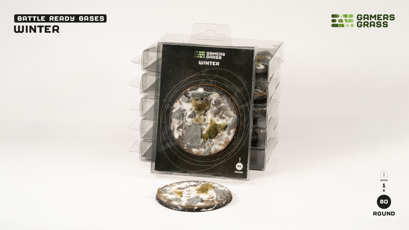 This pack contains 1 x 80mm wide round Battle Ready Base in a winter theme.