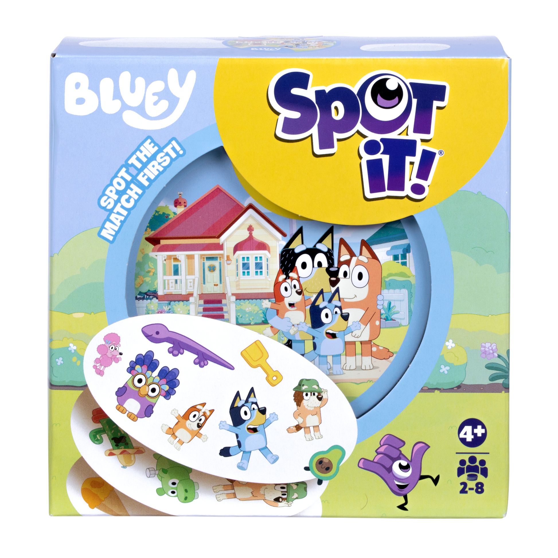 This fast-paced fun family game of observation and quick reflexes is ideal for players aged 4 and up. Be the first to spot the only matching Bluey character symbols between two cards to win! Spot some of your favorite Bluey Characters like Bluey, Bingo, Chilli, Bandit, and more. Cards come in a keep safe "Spot It!" tin. Includes 55 playing cards and is a great game for 2-8 players, making it the perfect party game!